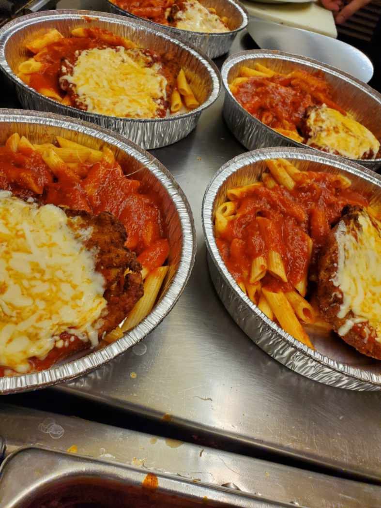 Perfect for date night in or a night off cooking, enjoy 2 chicken parmesan with penne and chicken soup or coleslaw.