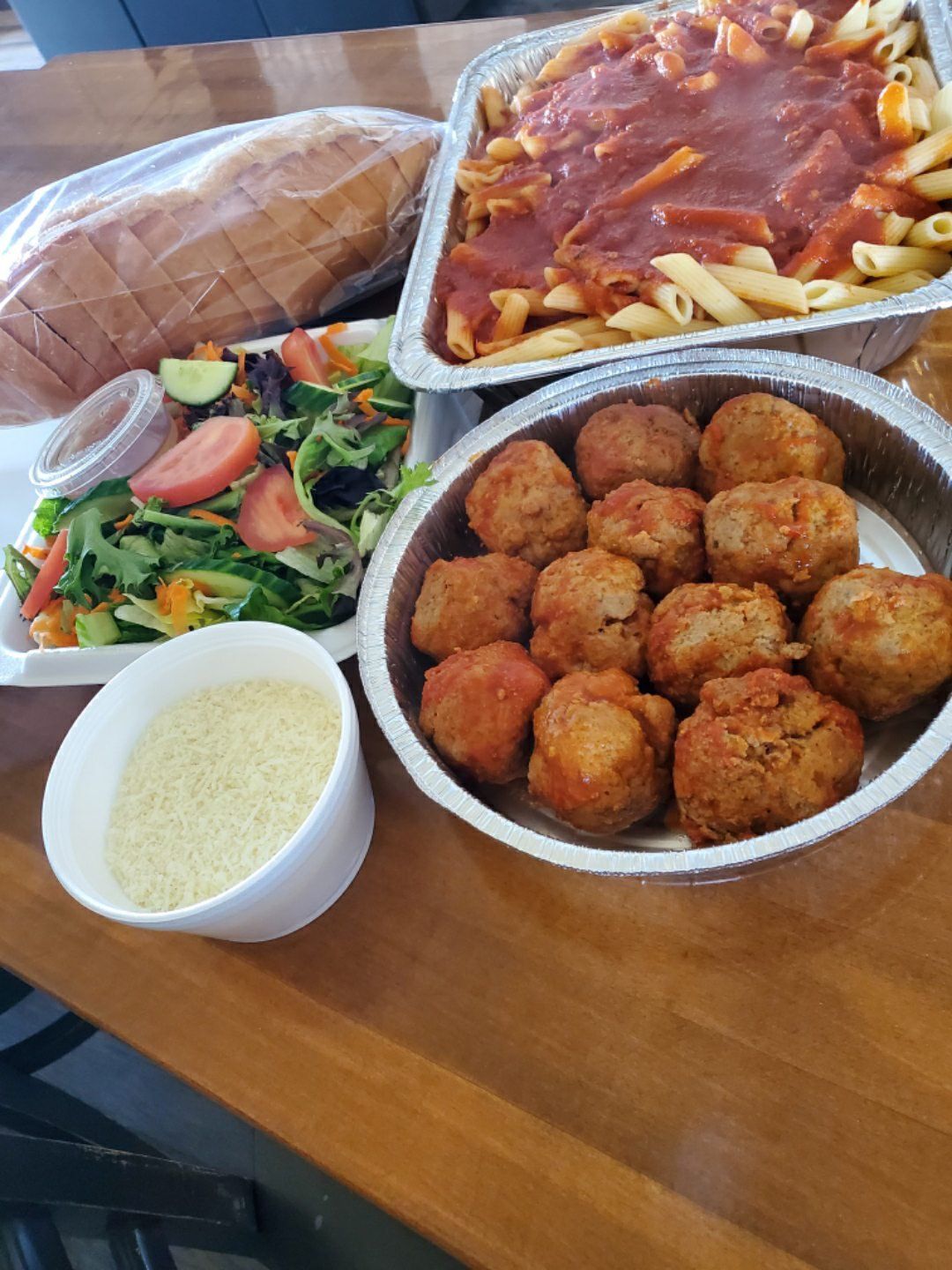 Feed the whole family with our family-size pasta dinner special: 9x13 tray of penne pasta, 12 meatballs, large garden salad, bread w/ butter, and parmesan cheese.